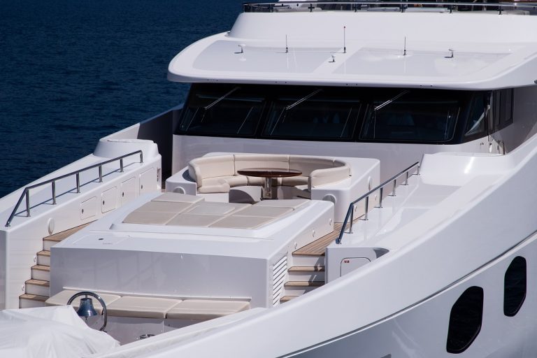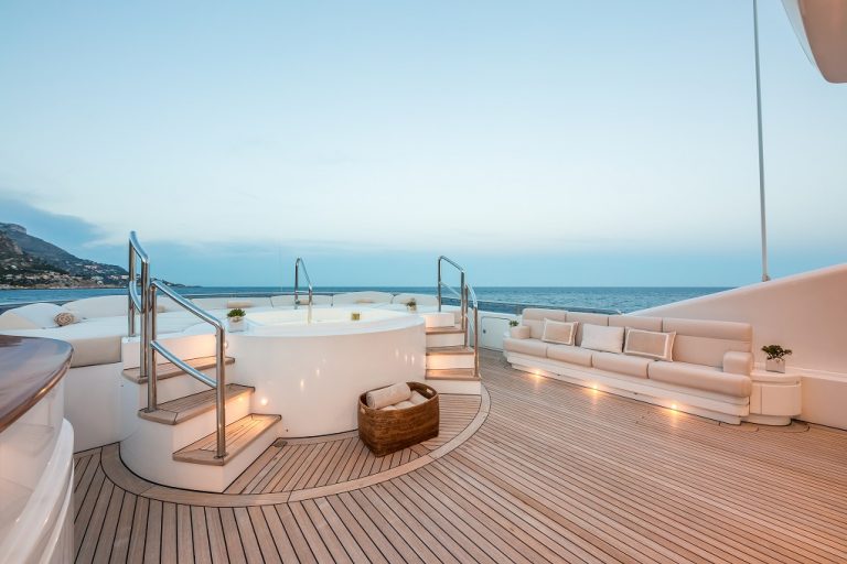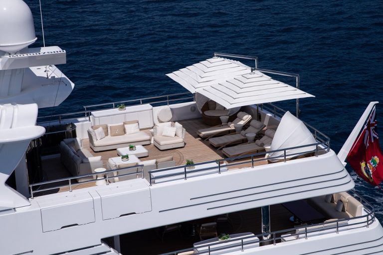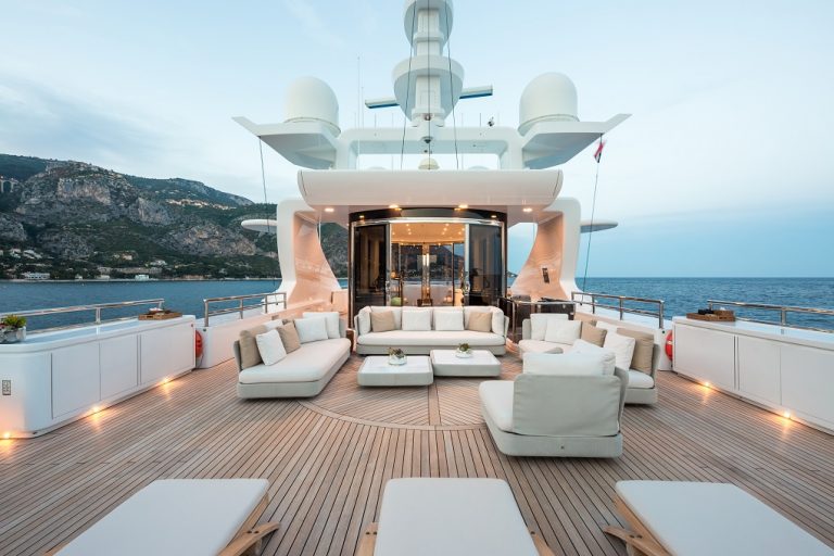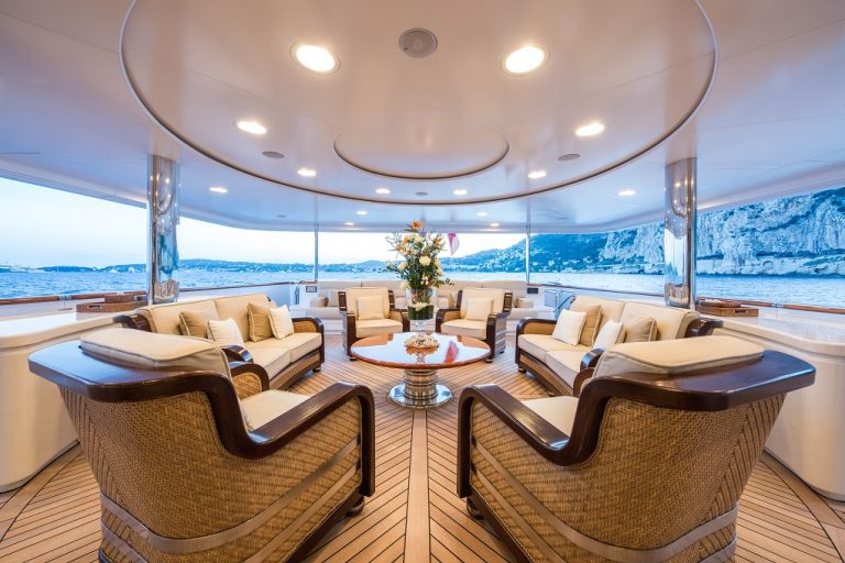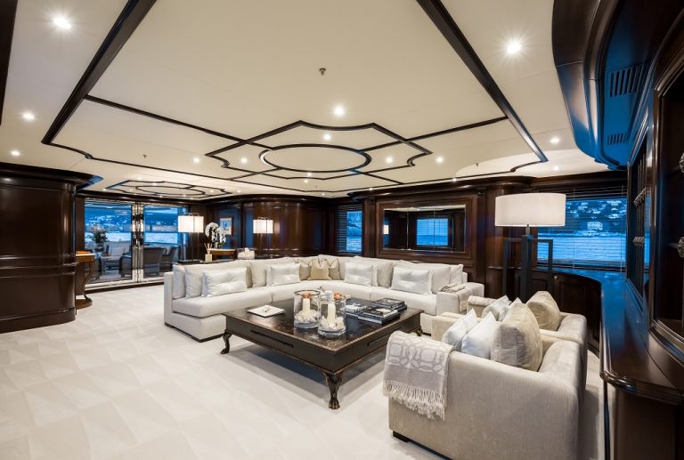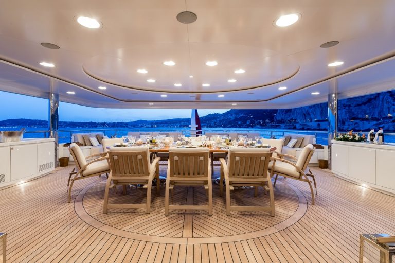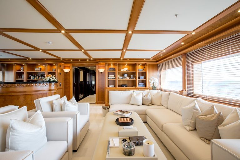The 164’ (50m) yacht ELENI invites you and your guests to soak up views from her generous sundeck with air-conditioned gym, jacuzzi and plenty of lounging options. Meals can be enjoyed al fresco and fully shaded on an equally spacious upper deck aft. She can welcome a party of 12 in a refined dark wood and light cream furnished interior.