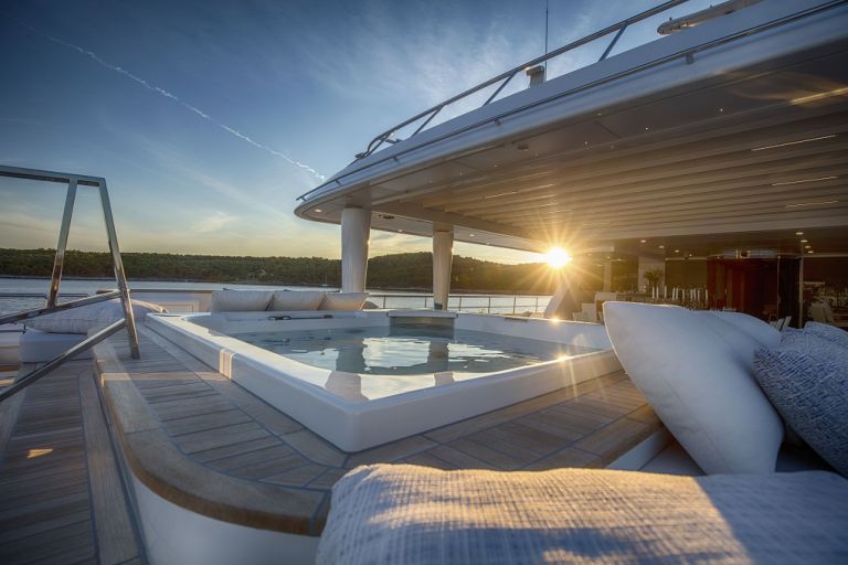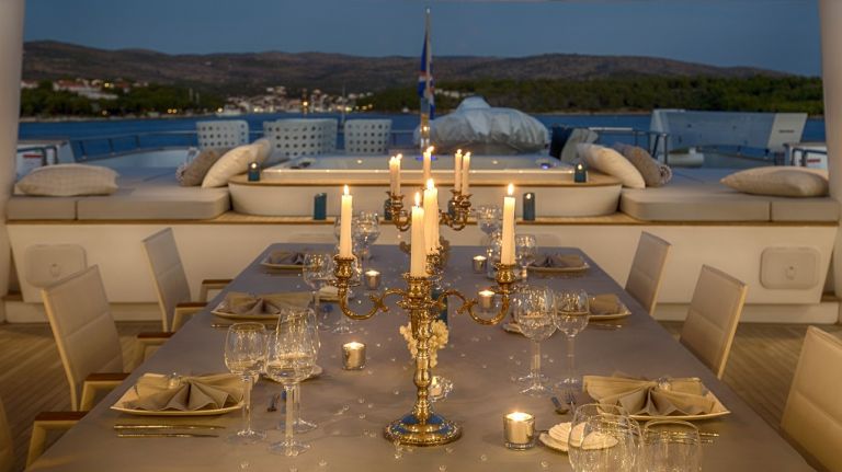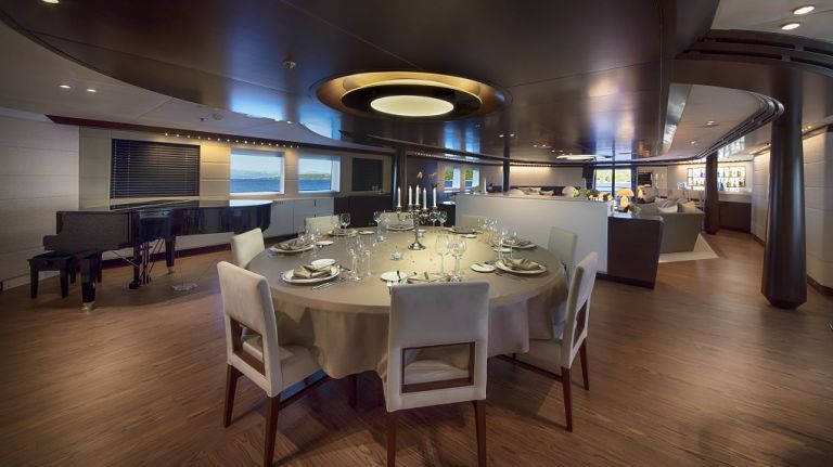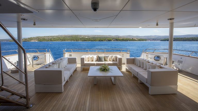 The 197’ (60m) yacht KATINA offers 6 spacious staterooms, 2 of which have a fold-down sea balcony. Her deck spaces are huge and allow you to host up to 150 guests for parties. She even has a whiskey and cigar room with ventilation for entertaining.