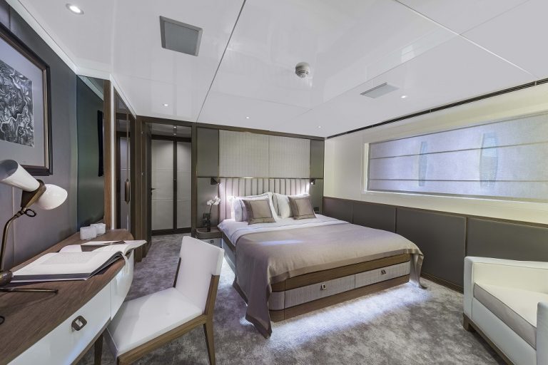 She offers five ensuite staterooms allowing for up to eleven guests as well as professionally equipped gym, 180º fully open Skylounge with balconies, Jacuzzi with a waterfall, beach club and much more.