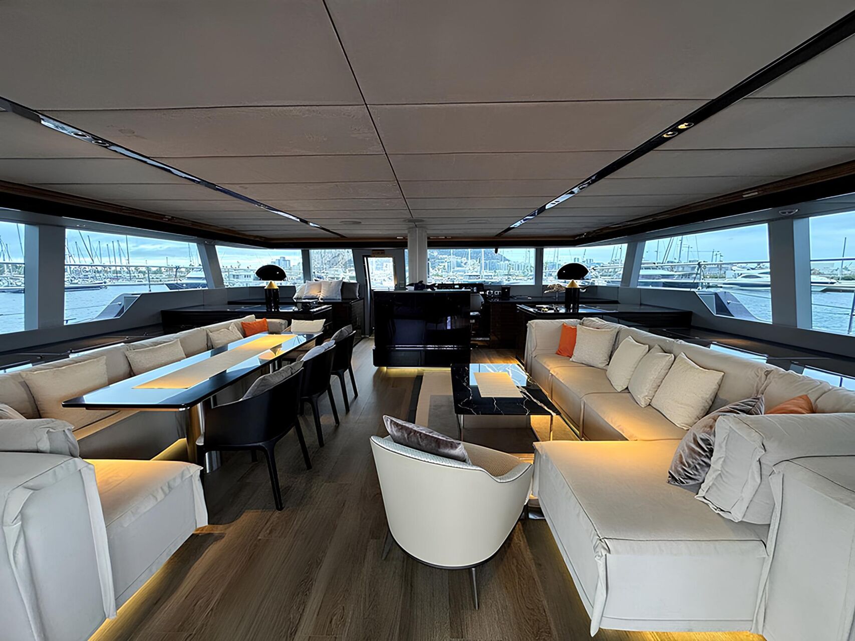 The spacious and bright interior accommodates 6 guests in 3 sumptuous en-suite staterooms, including a forward master suite offering panoramic views. She also comfortably houses 3 crew members in two separate cabins, perfect for fully serviced private or charter usage. The expansive flybridge hosts the main helm alongside premium leisure areas, providing panoramic views whether underway or at anchor.