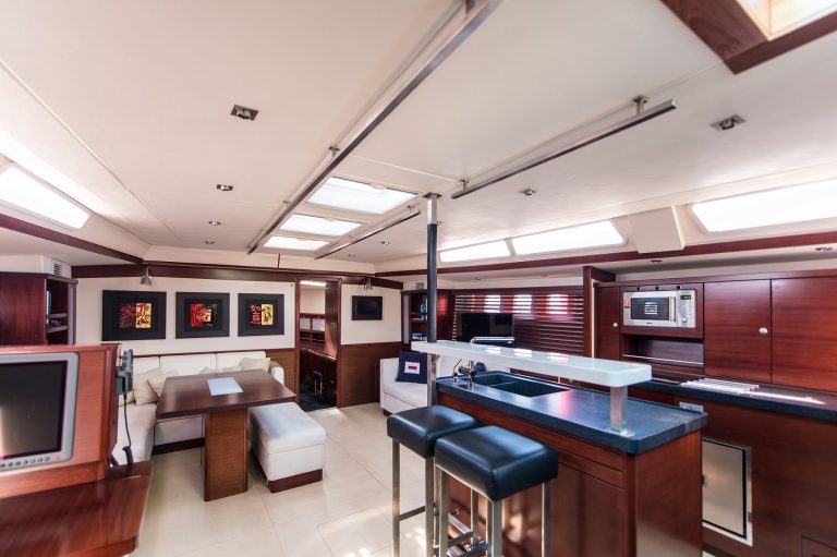 She features three ensuite staterooms, accommodating up to six guests comfortably. The yacht also boasts a copper-coated bottom, providing enhanced antifouling properties and reducing maintenance needs.