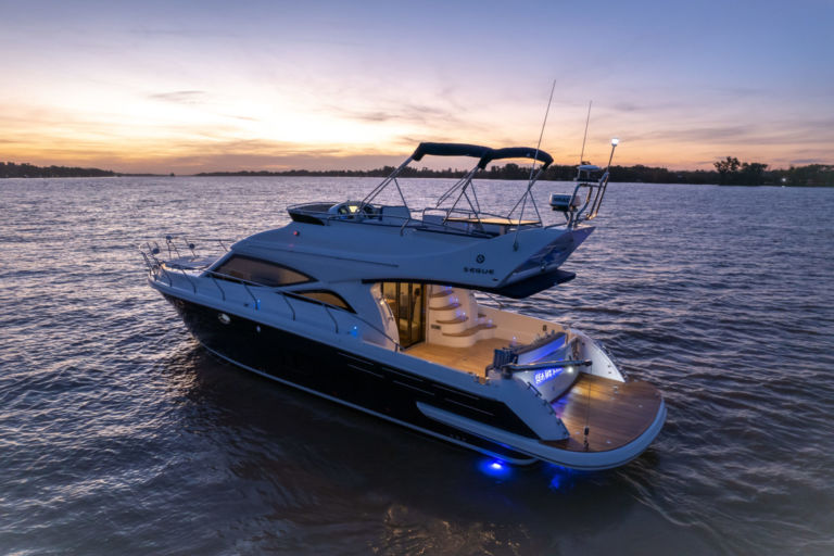 This Segue 46 Flybridge, SEA THE STARS has the impressive drive available from its twin Cummins engines to power you through the water when you want to skim the ocean at up to 32 knots, and it has the class, the light and airy space, and the comfortable luxury finish, for entertaining your guests when moored dockside.