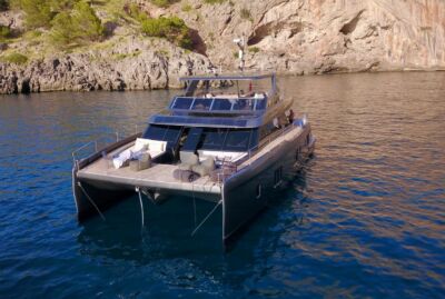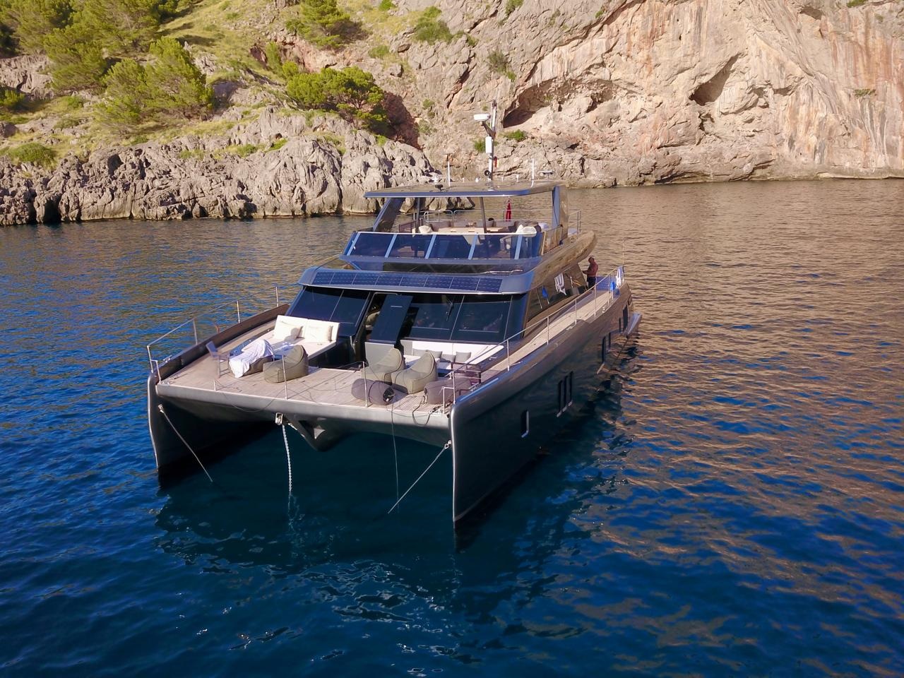 – Advanced solar energy system with photovoltaic panels seamlessly integrated into the hulls, bimini roof, and superstructure, generating up to 21.5 kWp of clean energy.