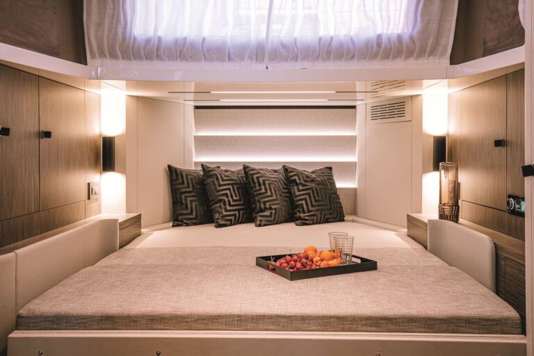 Experience agile, responsive handling with twin Volvo Penta D6-IPS650 engines (2 x 480 HP), achieving 33 knots max and 25-knot cruise over 200 nm range – enhanced by joystick, proportional bow thruster and Humphree trim assist.