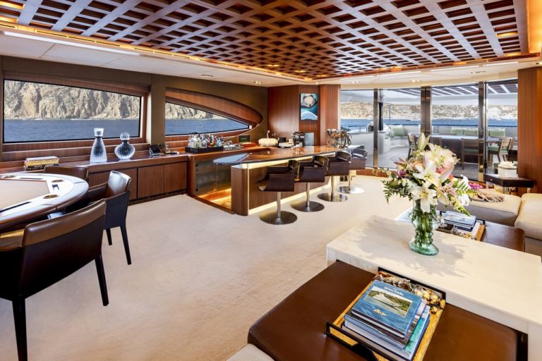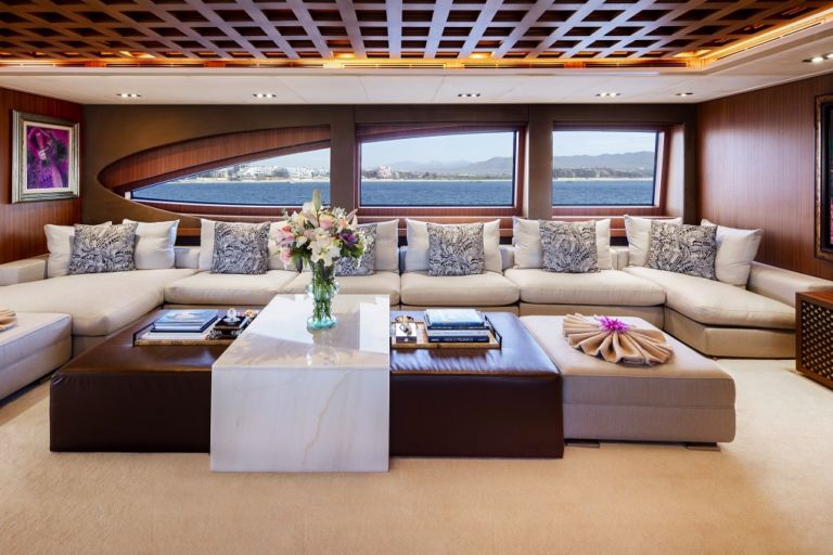 Her interiors are modern, sleek and refined, with emphasis placed on the excellent use of premium materials such as leather, suede, marble, onyx and walnut throughout. 6 staterooms, including a Master suite main deck forward with 180-degree vertical windows.