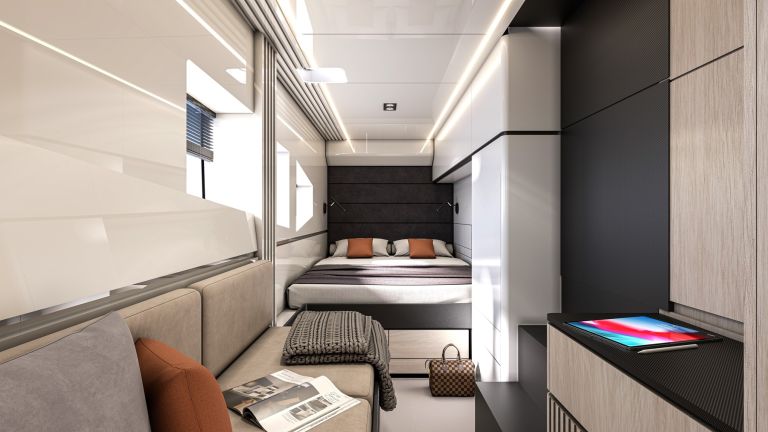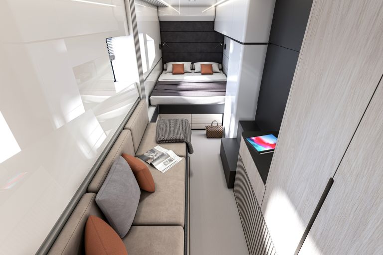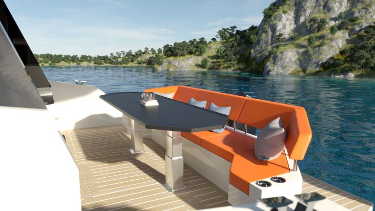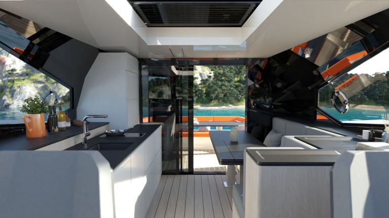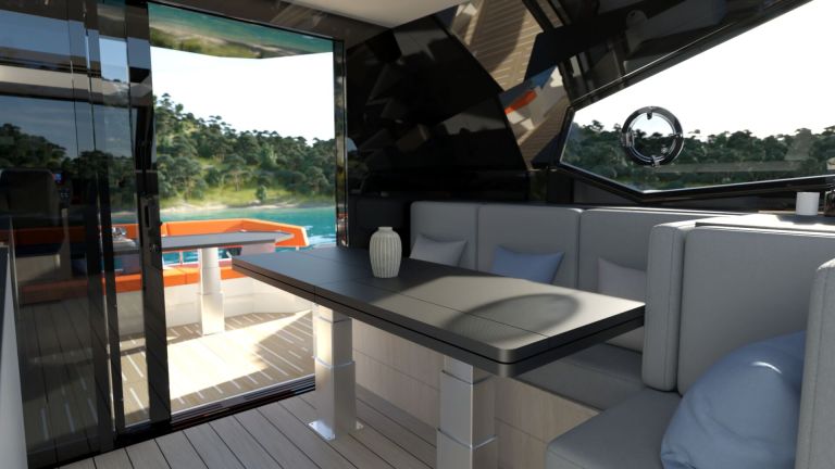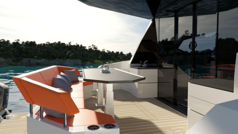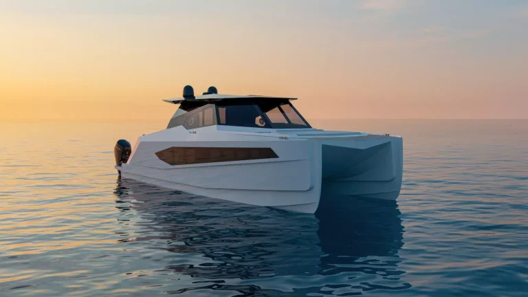 With its spacious 42’9″ length and wide 17’8″ beam, the 42C offers a thoughtfully arranged layout that connects indoor and outdoor spaces, providing flexibility for entertaining or relaxing. Constructed from aluminium and carbon fibre, and fitted with twin Mercury 600-hp outboards (with inboard options available), the yacht achieves speeds of over 40 knots while maintaining stability and fuel efficiency. Thanks in part to its advanced hydrofoils, the 42C delivers a smoother, more efficient ride, reducing drag and further improving performance and comfort—even at high speeds. Practical touches such as low-maintenance finishes, easy systems access, and generous storage throughout make day-to-day ownership straightforward. Large windows bring in natural light and ocean views, while flexible cabin arrangements and modern amenities allow for personalized comfort.